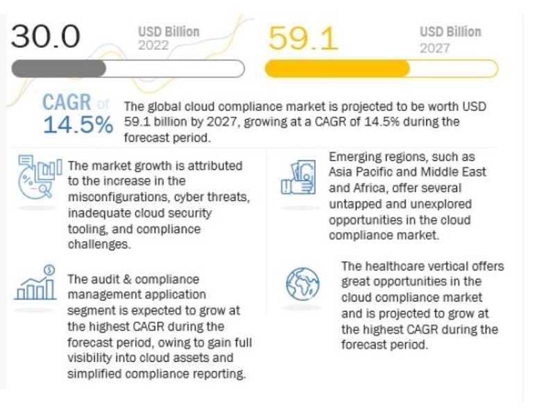 L’ecosistema di tecnologie, prodotti e servizi associati al cloud non tradisce le aspettative innescate dalle performance degli ultimi anni. A livello globale, si prevede che il mercato dei componenti e dei servizi per la conformità del cloud crescerà dai 30,0 miliardi di dollari dell’anno in corso ai 59,1 entro il 2027, con un CAGR del 14,5% durante il periodo di previsione. Quasi un raddoppio, dunque. La spinta decisiva alla crescita, secondo gli analisti di Marketsandmarkets, verrà dalla sempre più diffusa necessità delle organizzazioni di soddisfare gli standard di conformità, dopo l’impennata nell'adozione del cloud che ha contraddistinto il periodo pandemico.